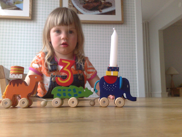 Två dagar sent, men idag blev det kalas för Mira, med hemlagad chokladtårta, ballonger, bokstavskex och födelsedagståget. Tre ljus att blåsa ut.