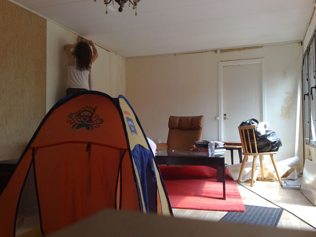 Nu är det dags för en ansiktslyftning av vardagsrummet. Det har varit orört så länge att det blivit helmodernt igen, om ni förstår. Men nu ryker den gamla strukturtapeten och läggs i svarta sopsäckar.
