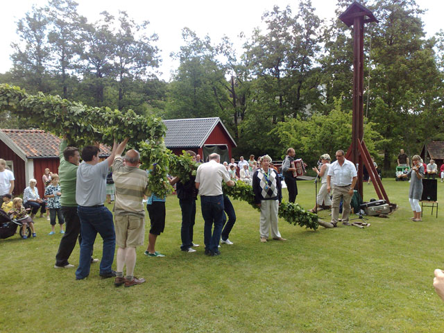 Midsommar, det är att rida som en cowboy på hästen. Det är att dricka saft och äta hembakt bröd. Det är att resa majstången och sedan dansa i ring, dansa omkring. Och det är att springa fort fort när regnet bara öser ner, och det är att sätta sig framför brasan för att bli varm och torr igen.