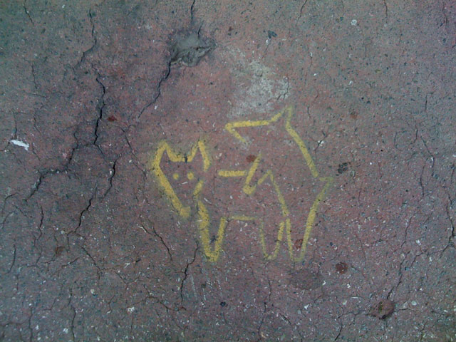 Först såg det ut som något skräp på marken, men vid en närmare titt var det en snabbskiss på två juckande hundar. Porr för hundar i marknivå. Senare på eftermiddagen såg jag bilden igen, nu målad lite högre upp på en lyktstolpe. Porr för de lite högre hundarna medan de ändå lättar på benet.