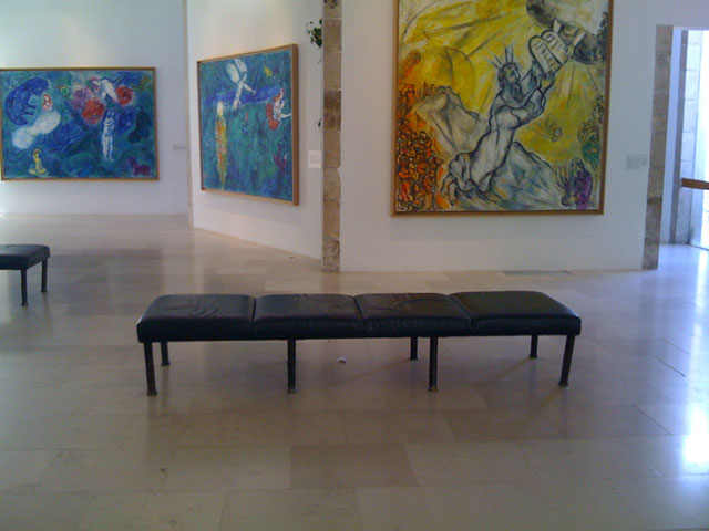 Och ska man titta på Chagall så kan man sätta sig på de bänkar som står utplacerade bland de stora, färggranna tavlorna i Chagallmuséet i Nice. Bänkarna verkar välsuttna, nersuttna, med de yttersta soffbenen pekande inåt som om de fått ge sig för årtiondes tyngd. Men tittar man noga efter så ser alla bänkar ut på samma sätt, vilket får mig att misstänka att det är en designfråga. Kanske Chagall själv som ritat bänkarna? Ska leta efter en namnteckning på benen nästa gång.