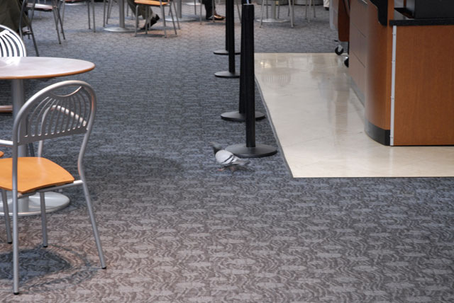 I min serie om duvor som dyker upp på konstiga ställen, har vi här antagligen en forskarduva. Lugnt spatserar den runt under borden på ett av kaffeställena en trappa ner i Moscone Conference center i San Francisco. Den tycks trivas på den heltäckande mattan, och masar sig bara lojt undan när någon stressad person inte har vett att gå runt duvan. Verkar vara en rätt behaglig tillvaro med värme och gott om mat.